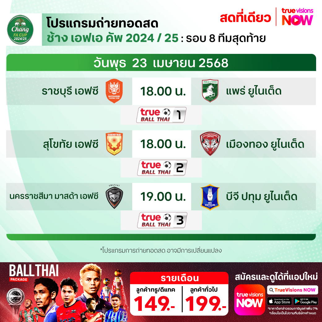 ราชบุรี เอฟซี พบ แพร่ ยูไนเต็ด เวลา 18.00-20.00 ทางช่อง True Ball Thai 1