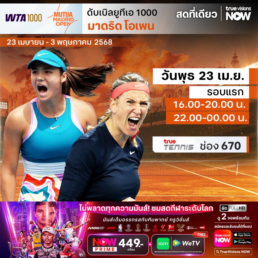 เทนนิสหญิง ดับเบิ้ลยูทีเอ ทัวร์ สัปดาห์นี้ พบกับรายการ มาดริด โอเพ่น รายการใหญ่ระดับ WTA 1000 จากกรุงมาดริด ประเทศสเปน รายการนี้เป็น รายการระดับ WTA 1000 รายการแรกที่แข่งขันในช่วงคอร์ทดิน นักเทนนิสมือระดับท็อปมาร่วมชิงชัยกันอย่างคับคั่ง ร่วมลุ้นว่าใครจะคว้าแชมป์รายการนี้ไปครอง ชมสด ครบทุกรอบ ที่ ทรูวิชั่นส์