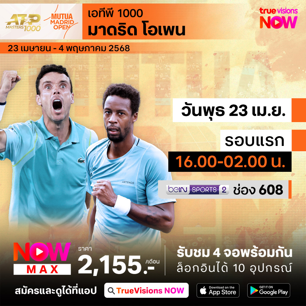 เทนนิสชาย เอทีพี ทัวร์ สัปดาห์นี้ พบกับรายการ มาดริด โอเพ่น รายการใหญ่ระดับ ATP 1000 จากกรุงมาดริด ประเทศสเปน รายการนี้เป็น รายการระดับ ATP 1000 รายการที่ 2 ที่แข่งขันในช่วงคอร์ทดิน นักเทนนิสมือระดับท็อปมาร่วมชิงชัยกันอย่างคับคั่ง ร่วมลุ้นว่าใครจะคว้าแชมป์รายการนี้ไปครอง ชมสด ครบทุกรอบ ที่ ทรูวิชั่นส์