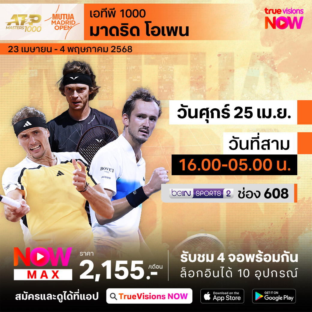 เทนนิสชาย เอทีพี ทัวร์ สัปดาห์นี้ พบกับรายการ มาดริด โอเพ่น รายการใหญ่ระดับ ATP 1000 จากกรุงมาดริด ประเทศสเปน รายการนี้เป็น รายการระดับ ATP 1000 รายการที่ 2 ที่แข่งขันในช่วงคอร์ทดิน นักเทนนิสมือระดับท็อปมาร่วมชิงชัยกันอย่างคับคั่ง ร่วมลุ้นว่าใครจะคว้าแชมป์รายการนี้ไปครอง ชมสด ครบทุกรอบ ที่ ทรูวิชั่นส์