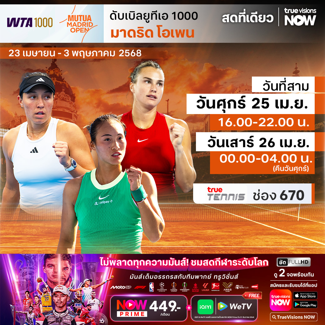 เทนนิสหญิง ดับเบิ้ลยูทีเอ ทัวร์ สัปดาห์นี้ พบกับรายการ มาดริด โอเพ่น รายการใหญ่ระดับ WTA 1000 จากกรุงมาดริด ประเทศสเปน รายการนี้เป็น รายการระดับ WTA 1000 รายการแรกที่แข่งขันในช่วงคอร์ทดิน นักเทนนิสมือระดับท็อปมาร่วมชิงชัยกันอย่างคับคั่ง ร่วมลุ้นว่าใครจะคว้าแชมป์รายการนี้ไปครอง ชมสด ครบทุกรอบ ที่ ทรูวิชั่นส์