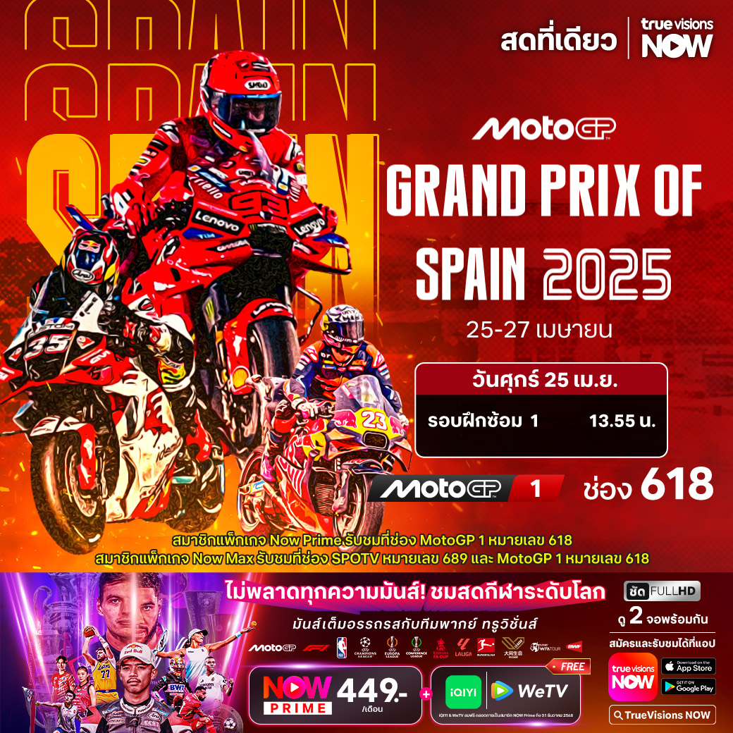 ศึกมอเตอร์ไซต์ชิงแชมป์โลก โมโตจีพี เปิดสงครามความเร็วในแผ่นดินยุโรป สนามแรก ประเดิมกันด้วยรายการที่เปี่ยมมนต์ขลังและเป็นที่ชื่นชอบของแฟนๆ อย่าง กรังด์ปรีซ์ ออฟ สเปน ที่สังเวียน เฮเรซ เซอร์กิต จับตาดูโฮมเรซของนักบิดเจ้าถิ่นระดับเต็งแชมป์ ทั้ง มาร์ก มาร์เกซ, อเล็กซ์ มาร์เกซ, ฆอร์เค่ มาร์ติน แย่งกันเป็นแชมป์ต่อหน้าแฟนๆ นับแสนคนในบ้านเกิด ชมสด เอ็กซ์คลูซีฟ ครบทุกช่วงสำคัญ ที่เดียวที่ ทรูวิชั่นส์
