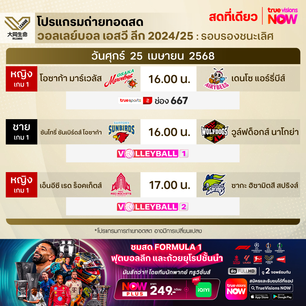 ซันโทรี่ ซันเบิร์ดส์ โอซาก้า พบ วูล์ฟด็อกส์ นาโกย่า เวลา 16.00 - 18.30 ทางช่อง Volleyball 1