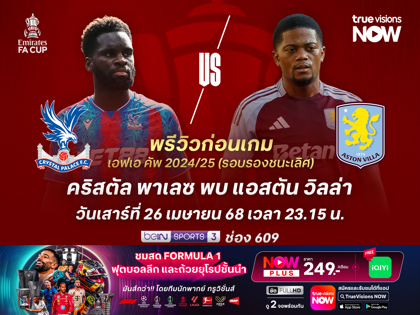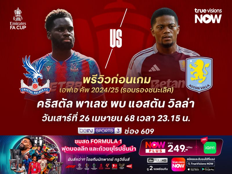 ศึกเอฟเอ คัพ อังกฤษ 2024-25 รอบรองชนะเลิศ คริสตัล พาเลซ จะพบกับ แอสตัน วิลล่า ที่สนาม เวมบลีย์โดยเกมนี้ พาเลซ ฟอร์มสะดุดไปในช่วงหลัง หลังไม่ชนะใครมา 4 เกมติดต่อกันแล้ว ขณะที่ วิลล่า แม้ว่าจะสะดุดแพ้ในเกมล่าสุด แต่ฟอร์มก่อนหน้านั้นถือว่าสุดยอดมากๆ หลังชนะไปถึง 10 เกมจากการลงเล่น 12 นัดหลัง และเกมนี้พวกเขามีโอกาสไม่น้อยที่จะได้ผ่านเข้าไปถึงรอบชิงชนะเลิศ