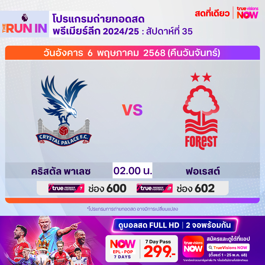 Crystal Palace vs Nottingham Forest เวลา 02:00 - 04:00 ทางช่อง TPF 1 (600) / TPF 2 (602)