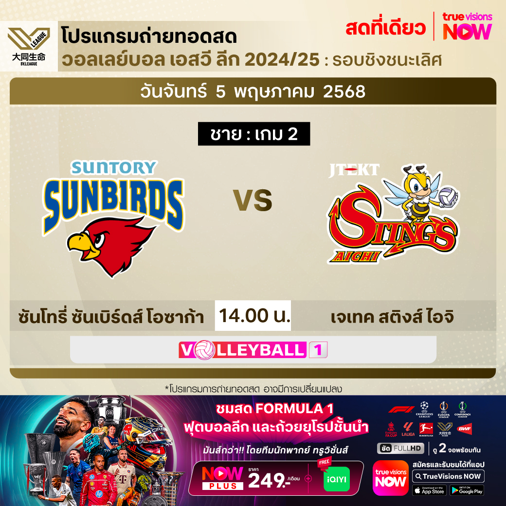ซันโทรี่ ซันเบิร์ดส์ โอซาก้า พบ เจเทค สติงส์ ไอจิ เวลา 14.00 - 16.30 ทางช่อง Volleyball 1