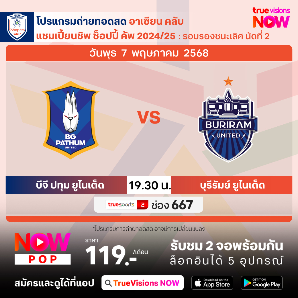 บีจี ปทุม ยูไนเต็ด พบ บุรีรัมย์ ยูไนเต็ด เวลา 19.30-21.30 ทางช่อง TS 2 (667)