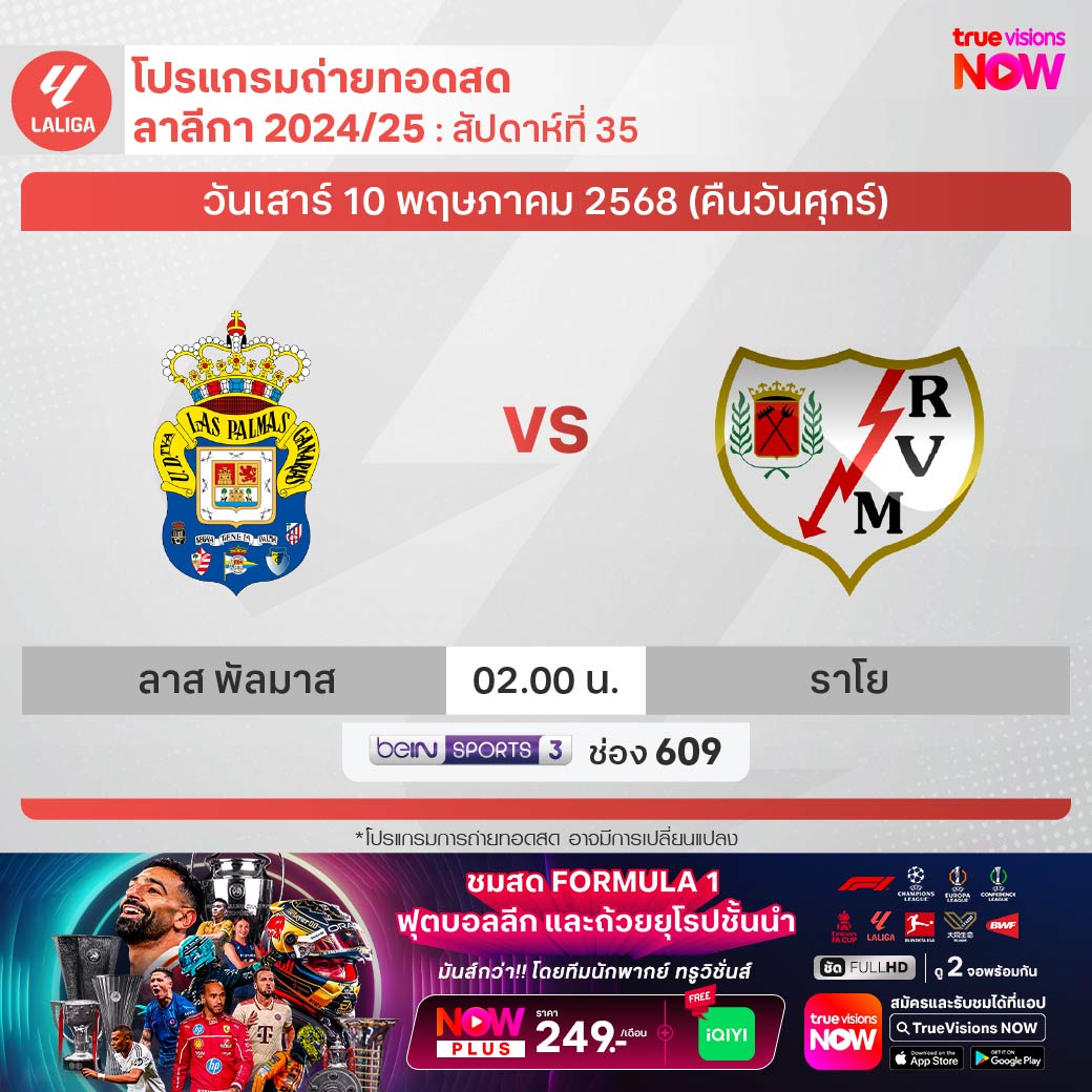 Las Palmas vs Rayo Vallecano เวลา 02.00-04.00 ทางช่อง beIN 3 (609)