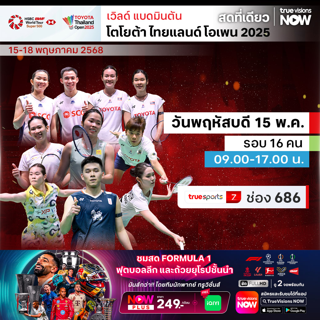 ระดับ เวิลด์ ทัวร์ ซูเปอร์ 500 โตโยต้า ไทยแลนด์ โอเพ่น 2025 มาถึงแล้ว และจะมาพร้อมกับความมันส์ระดับโลก ที่แฟน ๆ ห้ามพลาด ส่งใจเชียร์นักแบดมินตันไทย สู้สุดใจกับนักกีฬาระดับโลกจากนานาชาติ เพื่อตำแหน่งแชมป์อันทรงเกียรติในบ้านเกิด ชมสด เอ็กซ์คลูซีฟ ที่เดียวที่ ทรูวิชั่นส์