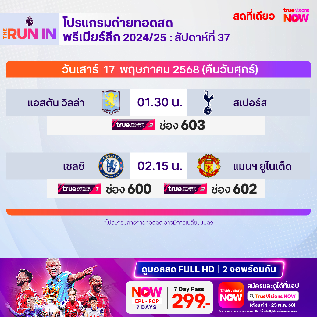 Chelsea vs Man Utd เวลา 02:15 - 04:15 ทางช่อง TPF 1 (600) / TPF 2 (602)