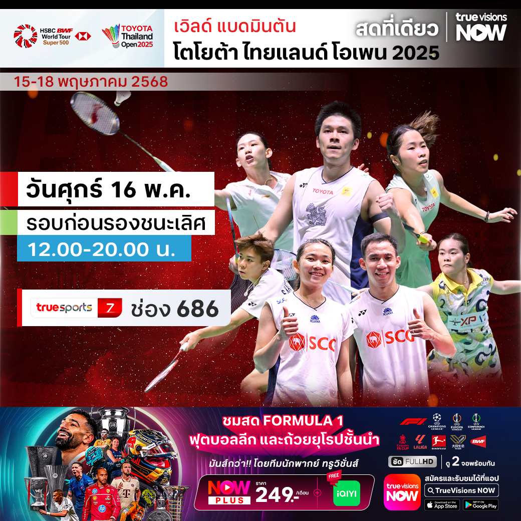 ระดับ เวิลด์ ทัวร์ ซูเปอร์ 500 โตโยต้า ไทยแลนด์ โอเพ่น 2025 มาถึงแล้ว และจะมาพร้อมกับความมันส์ระดับโลก ที่แฟน ๆ ห้ามพลาด ส่งใจเชียร์นักแบดมินตันไทย สู้สุดใจกับนักกีฬาระดับโลกจากนานาชาติ เพื่อตำแหน่งแชมป์อันทรงเกียรติในบ้านเกิด ชมสด เอ็กซ์คลูซีฟ ที่เดียวที่ ทรูวิชั่นส์