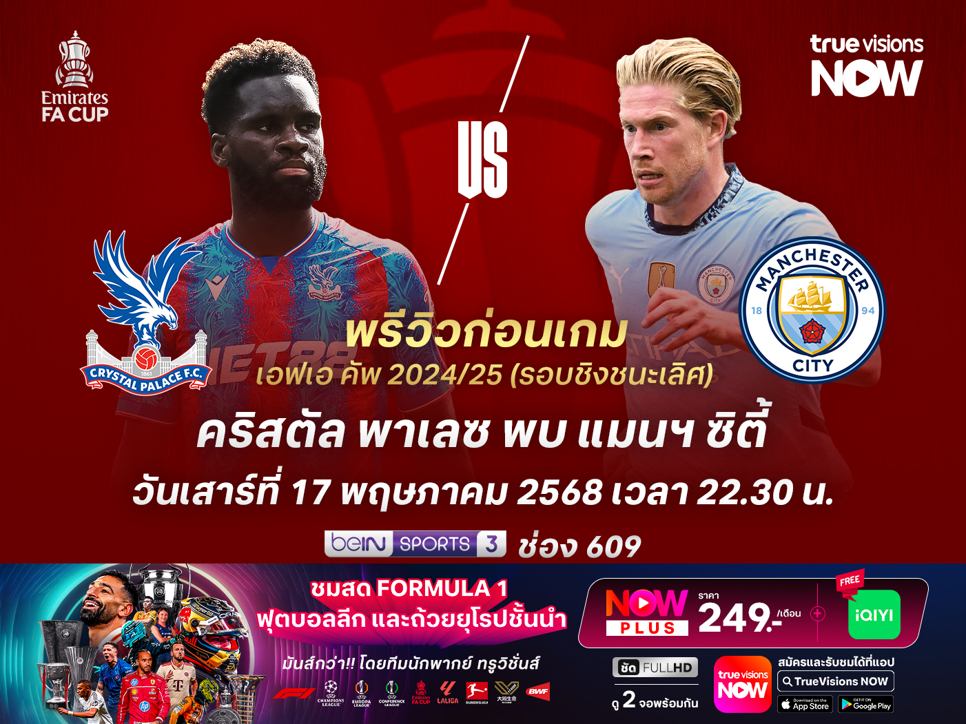 ศึกเอฟเอ คัพ อังกฤษ 2024-25 รอบชิงชนะเลิศ คริสตัล พาเลซ จะพบกับ แมนฯ ซิตี้ ที่สนาม เวมบลีย์โดยเกมนี้ พาเลซ ฟอร์มค่อนข้างดีเลยในช่วงหลัง หลังไม่แพ้ใครมา 5 เกมติดต่อกันแล้วในทุกรายการ และชนะได้ถึง 8 เกมจาก 14 นัดหลังสุด ขณะที่ แมนฯ ซิตี้ ฟอร์มกลับมาเข้าที่เข้าทางอีกครั้งในช่วงโค้งสุดท้ายของฤดูกาล หลังไม่แพ้ใครมา 10 เกมติดต่อกันแล้ว และชนะไปได้ถึง 7 เกม นัดนี้พวกเขาหมายมั่นปั้นมือที่จะคว้าแชมป์เอฟเอ คัพ มาครองให้ได้ เพื่อเป็นการชดเชยฟอร์มการเล่นที่ตกต่ำไปในฤดูกาลนี้