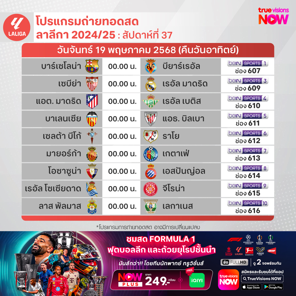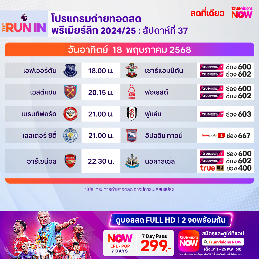 วันนี้มีอะไรดูที่ ทรูวิชั่นส์ ประจำวันอาทิตย์ที่ 18 พฤษภาคม 68 ยังคงมีกีฬาที่น่าสนใจให้ได้ตามลุ้นตามเชียร์กันเหมือนเดิม โดยในส่วนของฟุตบอลนั้นยังมีศึกพรีเมียร์ลีก อังกฤษ, ลา ลีกา สเปน, เมเจอร์ลีก ซอคเก้อร์, รีโว่ คัพ และ ฟุตซอลไทยลีก ให้ได้ตามเชียร์กันต่อ ส่วนกีฬาอื่นๆ ยังมีศึกฟอร์มูล่า วัน รายการ เอมิเลีย โรมันญ่า กรังด์ปรีซ์, เทนนิส เอทีพี ทัวร์ รายการ อิตาเลียน โอเพ่น, ดับเบิ้ลยูทีเอ ทัวร์ รายการ สตราสบูร์ก อินเตอร์เนชั่นแนล, กอล์ฟเมเจอร์ รายการ พีจีเอ แชมเปี้ยนชิพ, พีจีเอ ทัวร์ แชมเปี้ยนส์ รายการ รีเจียนส์ เทรดดิชั่น, แบดมินตัน บีดับเบิ้ลยูเอฟ รายการ ไทยแลนด์ โอเพ่น และ บาสเกตบอลเอ็นบีเอ รอบเพลย์ออฟ งานนี้ ทรูวิชั่นส์ จัดเต็มให้ชมกันถึงบ้าน