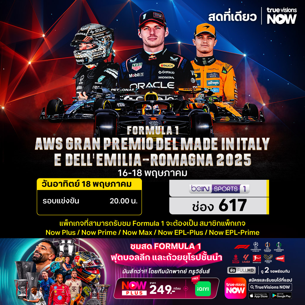 ศึกฟอร์มูล่า วัน เดินทางมาถึงช่วงสำคัญของฤดูกาลแล้ว กับการแข่งขันสนามที่ 7 และเป็นสนามแรกในแผ่นดินยุโรป ที่จะเปิดศึกสู้กันอย่างไม่มีใครยอมใครยาวไปจนถึงเดือนกันยายน สัปดาห์นี้ ประเดิมสนามในยุโรปกันด้วยรายการ เอมิเลีย โรมันญ่า กรังด์ปรีซ์ ที่สังเวียน เอนโซ่ เฟอร์รารี่ อินเตอร์เนชั่นแนล เซอร์กิต ประเทศอิตาลี จับตาดูการลุ้นแชมป์ของทีมยักษ์ใหญ่ ใครจะได้สะใจ ใครจะผิดหวัง ชมสด เอ็กซ์คลูซีฟ ที่เดียวที่ ทรูวิชั่นส์