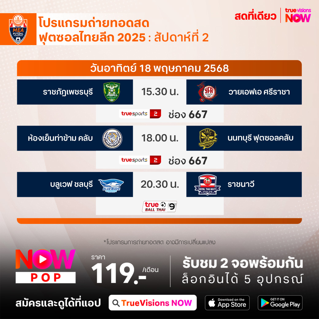สโมสรฟุตซอลบลูเวฟ ชลบุรี พบ สโมสรฟุตซอลราชนาวี เวลา 20:30 ทางช่อง True Ball Thai 9