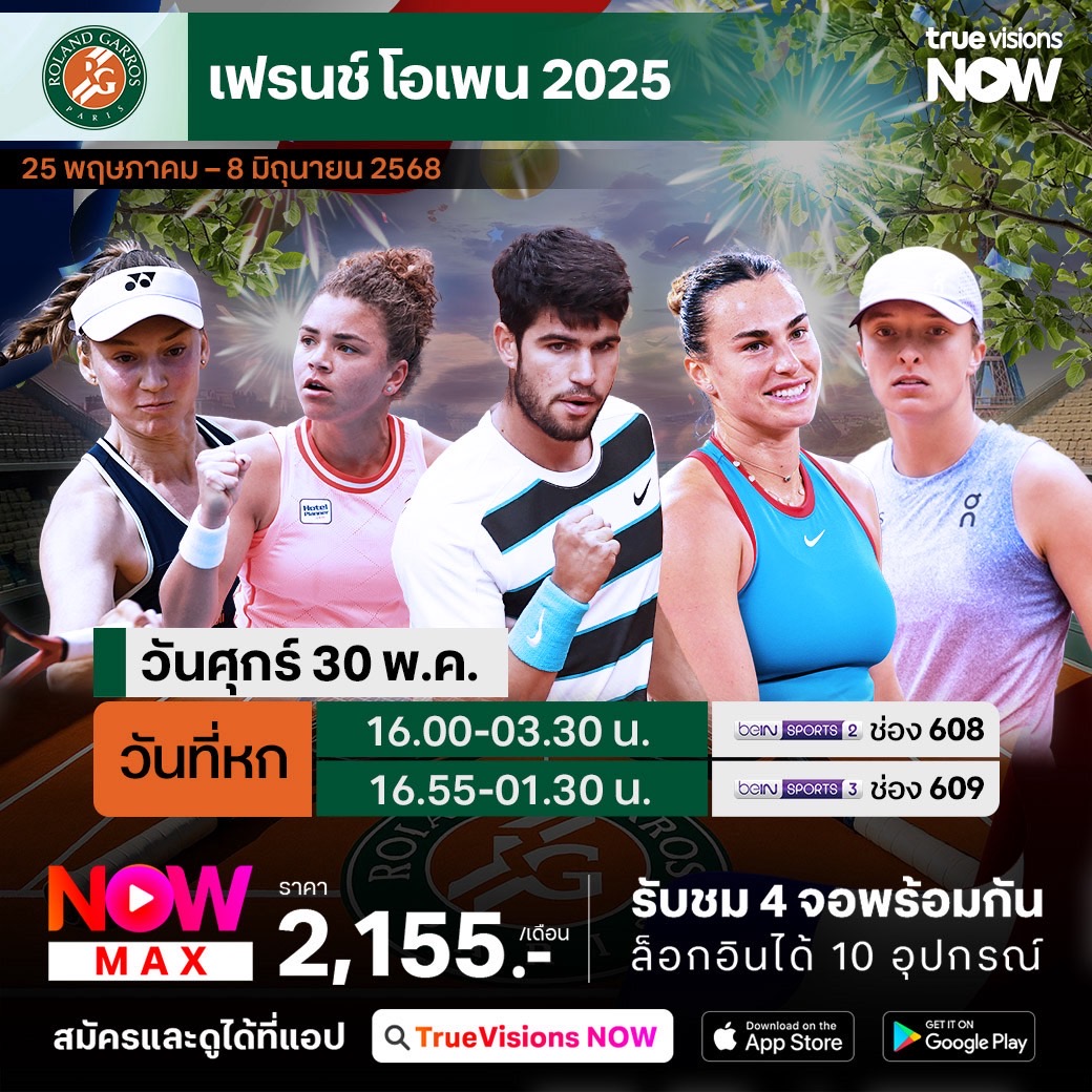 ศึกเทนนิสแกรนด์สแลมที่ 2 ของปี เฟร้นช์ โอเพ่น แกรนด์สแลมที่แข่งขันขันบนคอร์ทดิน จากกรุงปารีส ประเทศฝรั่งเศส เปิดฉากขึ้นแล้ว บรรดานักหวดลูกสักหลาดมือระดับท็อปต้องต่อสู้กับสภาพสนามที่ต้องใช้ความแข็งแกร่งของร่างกายอย่างมาก ร่วมลุ้นกันว่านักเทนนิสชายและนักเทนนิสหญิงคนไหนจะคว้าแชมป์แกรนด์สแลมที่ 2 ของปีไปครอง ชมสด ครบทุกรอบ แบบเอ็กซ์คลูซีฟ ที่ ทรูวิชั่นส์ ที่เดียว