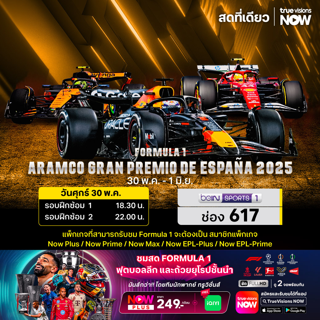 ฟอร์มูล่า วัน เวิลด์ แชมเปี้ยนชิพ เรซที่ 9 ของฤดูกาล 2025 ถึงคิวแข่งในแดนกระทิงดุ ประเทศสเปน กับศึก สแปนิช กรังด์ปรีซ์ ที่สังเวียน คาตาลุนญ่า เซอร์กิต จับตาการฟาดฟันกันระหว่างนักแข่งระดับพระกาฬอย่าง แม็กซ์ เวอร์สแท็ปเพ่น, เซอร์ ลูอิส แฮมิลตัน, แลนโด นอร์ริส, ออสการ์ ปิแอสทรี่ รวมถึง จอร์ส รัสเซลล์ ใครจะเข้าวิน ชมสด เอ็กซ์คลูซีฟ ที่เดียวที่ ทรูวิชั่นส์