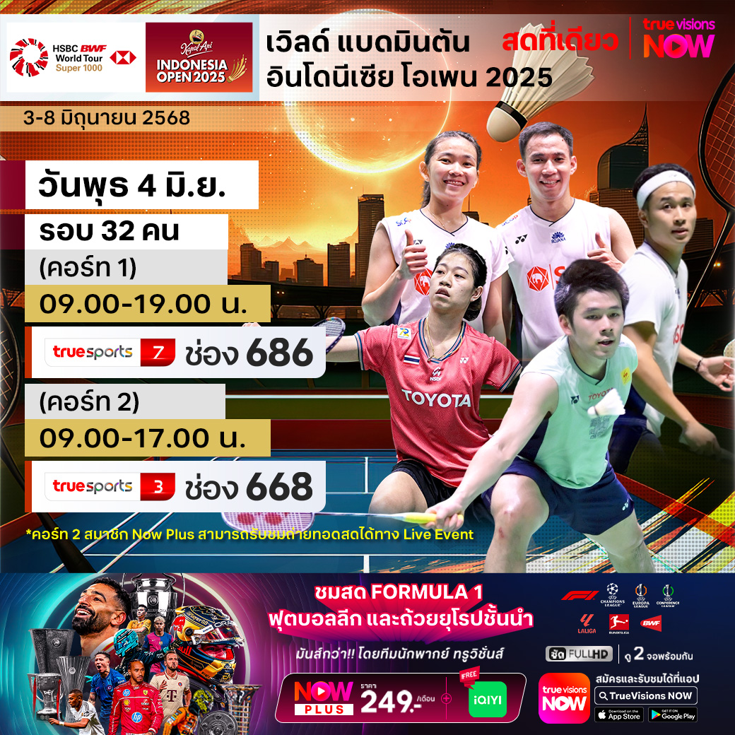 แบดมินตัน เก็บคะแนนสะสมโลก ยังปักหลักดวลเพลงตบกันที่ทวีปเอเชีย มือระดับโลกตบเท้าสู่แดนอินเหนา หนึ่งในชาติมหาอำนาจของกีฬาลูกขนไก่ สัปดาห์นี้ เป็นโปรแกรมใหญ่ ยักษ์ ระดับ เวิลด์ ทัวร์ ซูเปอร์ 1000 ในรายการ อินโดนีเซีย โอเพ่น 2025 ที่สังเวียนอิสโตร่า เสนายัน กรุงจาการ์ตาร์ ประเทศอินโดนีเซีย มีเงินรางวัลรวมให้ชิงกันถึง 1.45 ล้านเหรียญสหรัฐฯ ร่วมเชียร์นักแบดมินตันไทยสู้เพื่อคว้าชัยชนะ ชมสด ครบทุกรอบ แบบเอ็กซ์คลูซีฟ ที่เดียวที่ ทรูวิชั่นส์