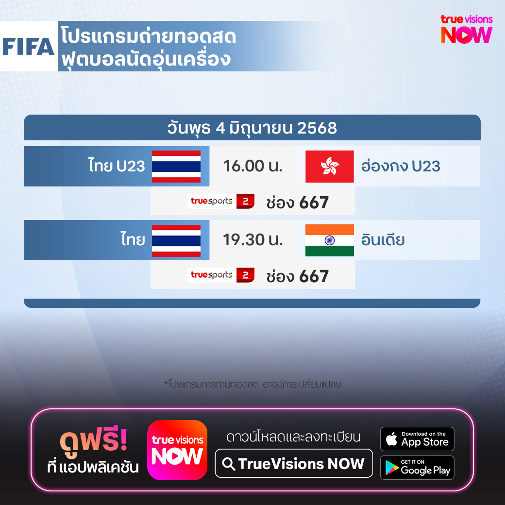 วันนี้มีอะไรดูที่ ทรูวิชั่นส์ ประจำวันพุธที่ 4 มิถุนายน 68 ยังคงมีกีฬาที่น่าสนใจให้ได้ตามลุ้นตามเชียร์กันเหมือนเดิม ในส่วนของฟุตบอลยังมีเกมนัดกระชัมมิตรระดับทีมชาติให้ได้ตามเชียร์กันต่อ ส่วนกีฬาอื่นๆ ยังมีเทนนิสแกรนด์สแลม รายการ เฟร้นช์ โอเพ่น และ แบดมินตัน บีดับเบิ้ลยูเอฟ รายการ อินโดนีเซีย โอเพ่น งานนี้ ทรูวิชั่นส์ จัดเต็มให้ชมกันถึงบ้าน