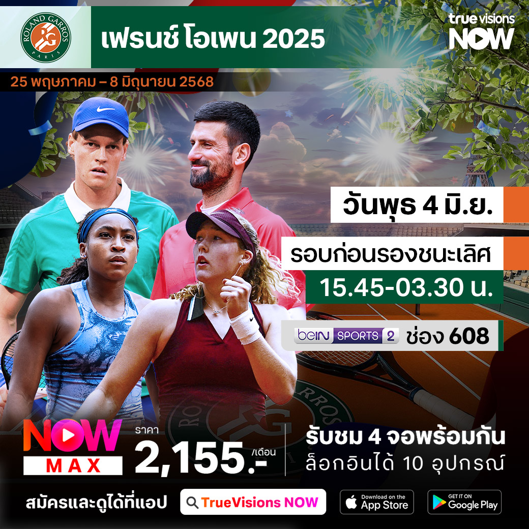 ศึกเทนนิสแกรนด์สแลมที่ 2 ของปี เฟร้นช์ โอเพ่น แกรนด์สแลมที่แข่งขันขันบนคอร์ทดิน จากกรุงปารีส ประเทศฝรั่งเศส เปิดฉากขึ้นแล้ว บรรดานักหวดลูกสักหลาดมือระดับท็อปต้องต่อสู้กับสภาพสนามที่ต้องใช้ความแข็งแกร่งของร่างกายอย่างมาก ร่วมลุ้นกันว่านักเทนนิสชายและนักเทนนิสหญิงคนไหนจะคว้าแชมป์แกรนด์สแลมที่ 2 ของปีไปครอง ชมสด ครบทุกรอบ แบบเอ็กซ์คลูซีฟ ที่ ทรูวิชั่นส์ ที่เดียว