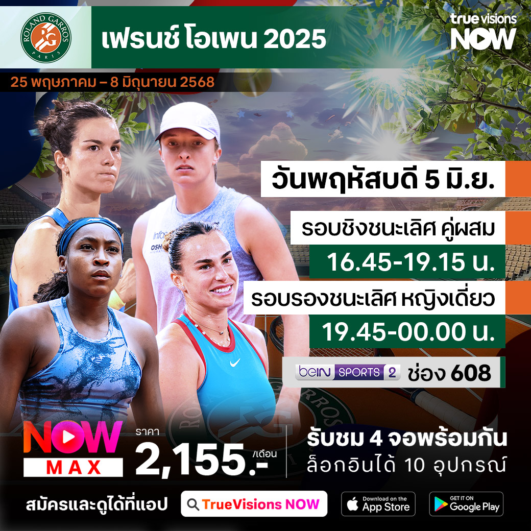 วันนี้มีอะไรดูที่ ทรูวิชั่นส์ ประจำวันพฤหัสบดีที่ 5 มิถุนายน 68 ยังคงมีกีฬาที่น่าสนใจให้ได้ตามลุ้นตามเชียร์กันเหมือนเดิม ในส่วนของเทนนิส ยังมีเทนนิสแกรนด์สแลม รายการ เฟร้นช์ โอเพ่น ให้ได้ตามเชียร์กันต่อเนื่อง ส่วนกีฬาอื่นๆ ยังมีกอล์ฟ พีจีเอ ทัวร์ รายการ อาร์บีซี แคนาเดียน โอเพ่น, ดีพี เวิลด์ ทัวร์ รายการ เคแอลเอ็ม โอพ่น, แบดมินตัน บีดับเบิ้ลยูเอฟ รายการ อินโดนีเซีย โอเพ่น และ บาสเกตบอลเอ็นบีเอ รอบเพลย์ออฟ ไฟนอลส์ งานนี้ ทรูวิชั่นส์ จัดเต็มให้ชมกันถึงบ้าน