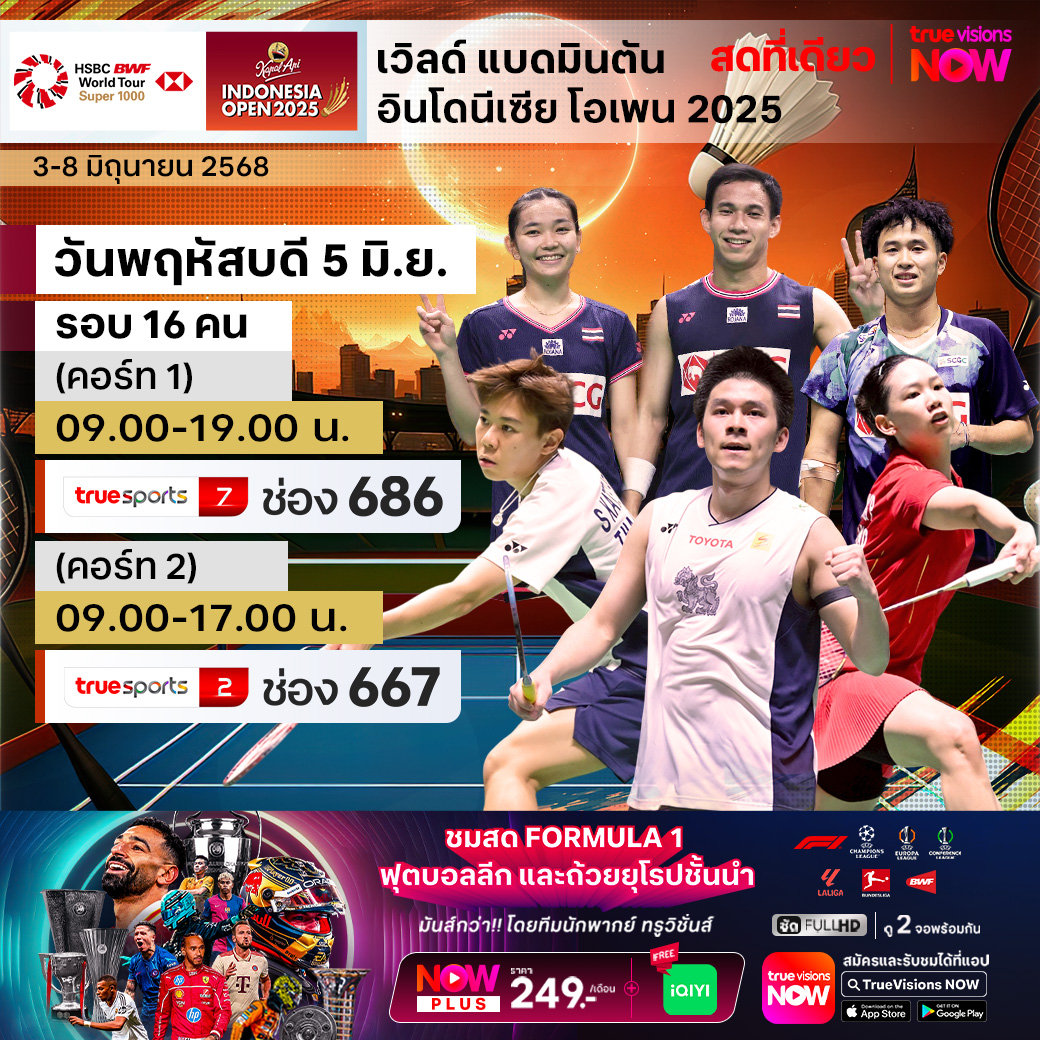 แบดมินตัน เก็บคะแนนสะสมโลก ยังปักหลักดวลเพลงตบกันที่ทวีปเอเชีย มือระดับโลกตบเท้าสู่แดนอินเหนา หนึ่งในชาติมหาอำนาจของกีฬาลูกขนไก่ สัปดาห์นี้ เป็นโปรแกรมใหญ่ ยักษ์ ระดับ เวิลด์ ทัวร์ ซูเปอร์ 1000 ในรายการ อินโดนีเซีย โอเพ่น 2025 ที่สังเวียนอิสโตร่า เสนายัน กรุงจาการ์ตาร์ ประเทศอินโดนีเซีย มีเงินรางวัลรวมให้ชิงกันถึง 1.45 ล้านเหรียญสหรัฐฯ ร่วมเชียร์นักแบดมินตันไทยสู้เพื่อคว้าชัยชนะ ชมสด ครบทุกรอบ แบบเอ็กซ์คลูซีฟ ที่เดียวที่ ทรูวิชั่นส์
