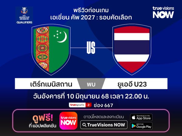 สำหรับ ฟุตบอลชายทีมชาติไทย จะทำการแข่งขันฟุตบอล เอเชียน คัพ 2027 รอบคัดเลือก แมตช์เดย์ที่ 2 พบกับ เติร์กเมนิสถาน ณ อัชกาบัต สเตเดียม ในวันอังคารที่ 10 มิถุนายน 2568 เวลา 22.00 น. ตามเวลาประเทศไทย ถ่ายทอดสด ทาง truesports2 (ช่อง 667)