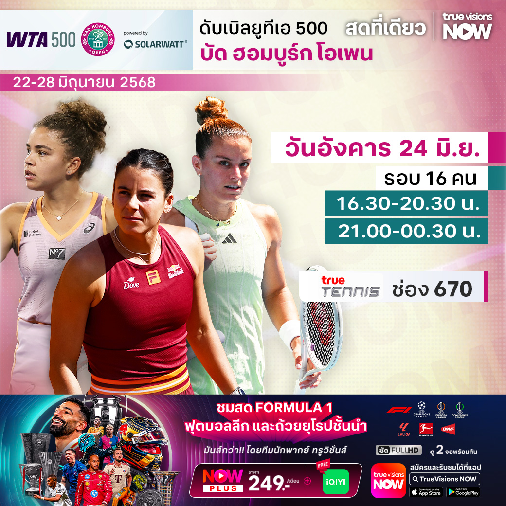 ต่อเนื่องกันเลยกับ เทนนิสหญิง ดับเบิ้ลยูทีเอ ทัวร์ รายการใหญ่ เพื่อเตรียมตัวก่อนเข้าสู่แกรนด์สแลมที่ 3 ของปีอย่างวิมเบิลดัน กับรายการ บัด ฮอมบูร์ก โอเพ่น ประเทศเยอรมนี บรรดามือดีของทัวร์ต่างลงแข่งกันอย่างพร้อมหน้า ร่วมลุ้นกันว่า ใครจะคว้าแชมป์รายการนี้ไปครอง ชมสด ครบทุกรอบ ที่ ทรูวิชั่นส์