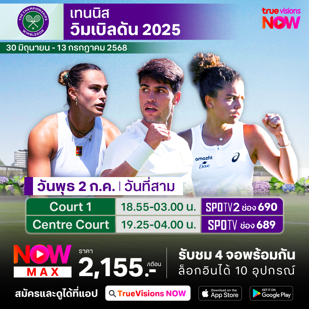 วันนี้มีอะไรดูที่ ทรูวิชั่นส์ ประจำวันพุธที่ 2 กรกฎาคม 68 ยังคงมีกีฬาที่น่าสนใจให้ได้ตามลุ้นตามเชียร์กันเหมือนเดิม โดยในส่วนของแฟนเทนนิสนั้น พลาดไม่ได้กับศึกเทนนิส แกรนด์สแลม วิมเบิลดัน ที่มีให้ได้ตามเชียร์กันต่อเนื่อง งานนี้ ทรูวิชั่. นส์ จัดเต็มให้ชมกันถึงบ้าน