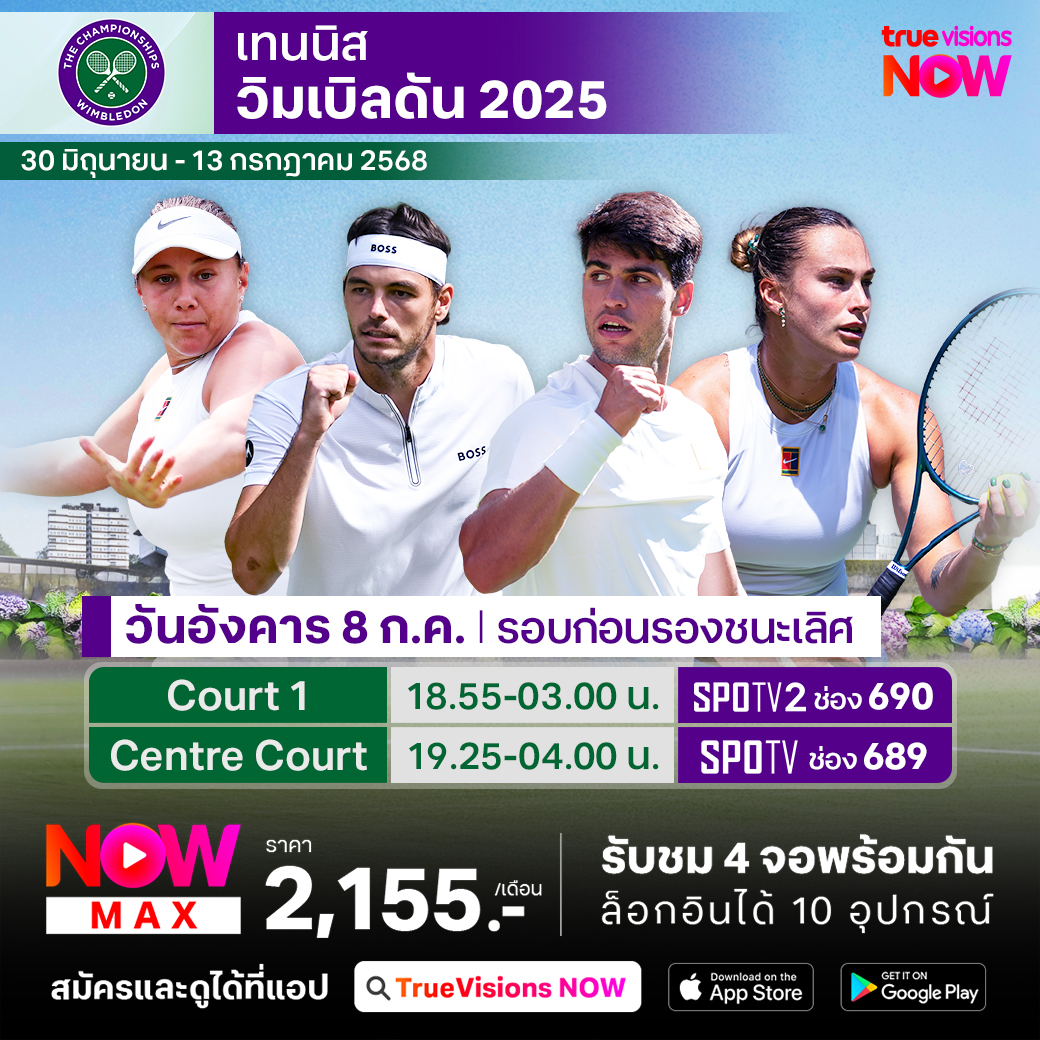 ศึกเทนนิส แกรนด์สแลม วิมเบิลดัน เทนนิสรายการแกรนด์สแลมที่เก่าแก่และมีมนต์ขลังมากที่สุดในโลก และเป็นการแข่งขันบนคอร์ทหญ้า ที่มีรูปแบบการเล่นที่แตกต่างและมีเอกลักษณ์ สุดยอดนักเทนนิสระดับโลกร่วมเข้าแข่งขันกันคับคั่ง เพื่อร่วมชิงชัยและคว้าแชมป์รายการที่ยิ่งใหญ่นี้ ร่วมลุ้นว่าใครจะคว้าแชมป์ชายเดี่ยวและหญิงเดี่ยวไปครอง ชมสด เอ็กซ์คลูซีฟ ที่เดียวที่ ทรูวิชั่นส์