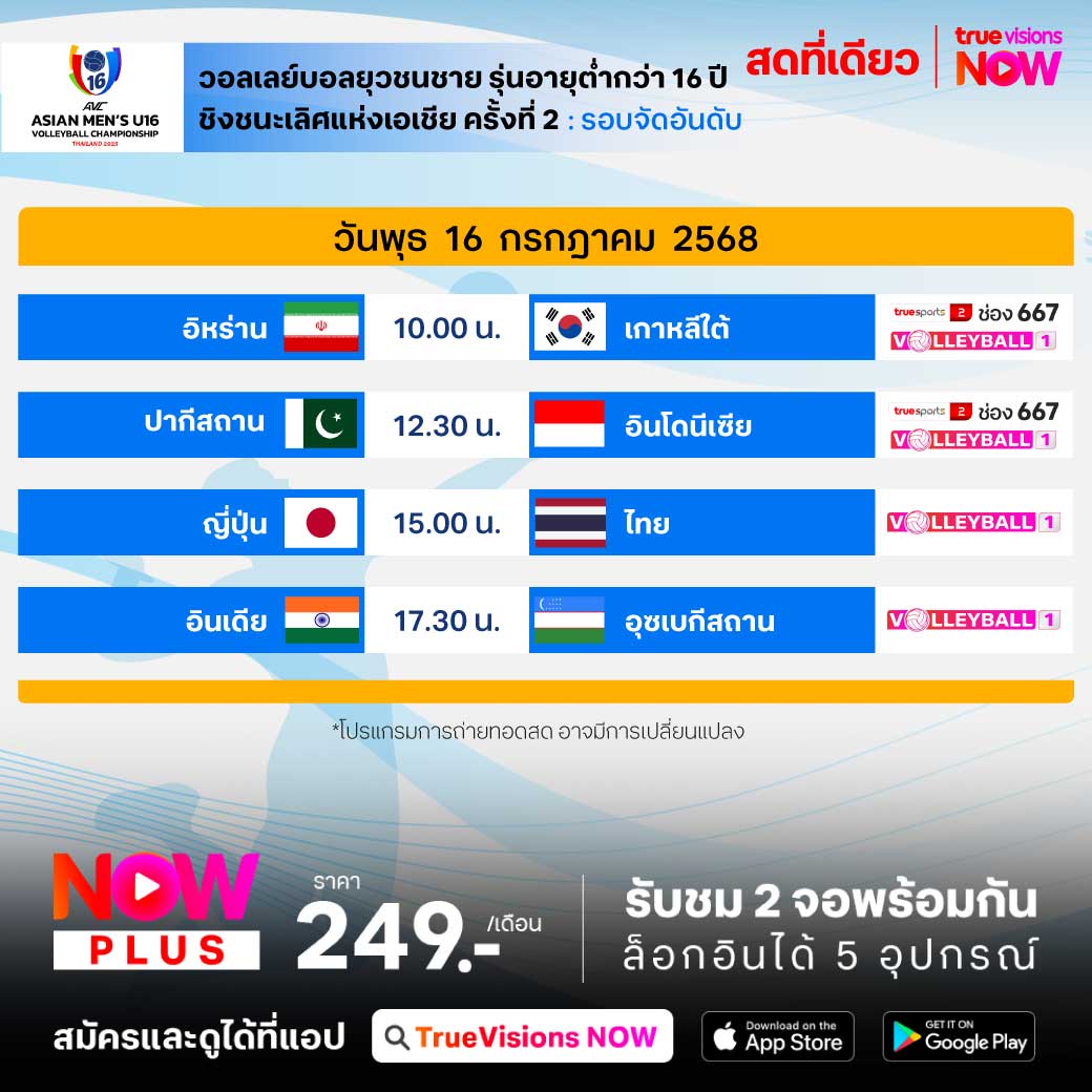 วันนี้มีอะไรดูที่ ทรูวิชั่นส์ ประจำวันพุธที่ 16 กรกฎาคม 68 ยังคงมีกีฬาที่น่าสนใจให้ได้ตามลุ้นตามเชียร์กันเหมือนเดิม โดยในส่วนของเทนนิส ยังมีเทนนิส เอทีพี ทัวร์ รายการ สวิส โอเพ่น ให้ได้ตามเชียร์กันต่อเนื่อง ส่วนกีฬาอื่นๆ ยังมี แบดมินตัน บีดับเบิ้ลยูเอฟ รายการ เจแปน โอเพ่น, ฟุตบอลชิงแชมป์อาเซียน 2025 รุ่นอายุไม่เกิน 23 ปี, ฟุตซอลไทยลีก 2025 และ วอลเลย์บอลยุวชนชาย รุ่นอายุต่ำกว่า 16 ปี ชิงชนะเลิศแห่งเอเชีย 2025 งานนี้ ทรูวิชั่นส์ จัดเต็มให้ชมกันถึงบ้าน