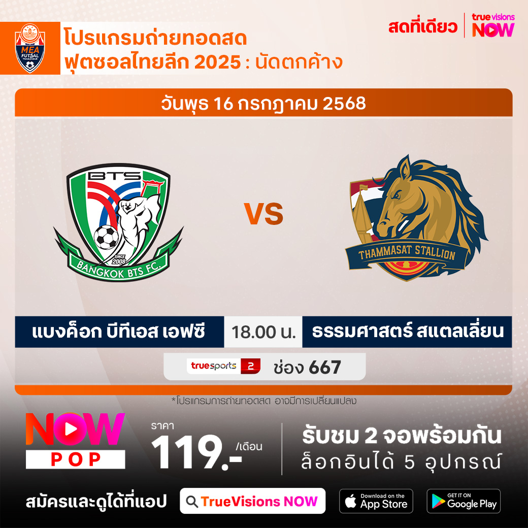 แบงค็อก บีทีเอส เอฟซี พบ ธรรมศาสตร์ สแตลเลี่ยน เวลา 18:00 ทางช่อง TS 2 (667)