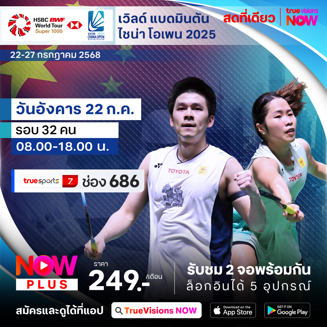 แบดมินตัน บีดับเบิ้ลยูเอฟ เก็บคะแนนสะสมโลก สัปดาห์นี้พบกับรายการสุดยิ่งใหญ่ ระดับ เวิลด์ ทัวร์ ซูเปอร์ 1000 ไชน่า โอเพ่น ที่เมืองฉางโจว ประเทศจีน จัดเต็มทั้งเงินรางวัลมหาศาล 64.5 ล้านบาท รวมถึงบรรดาซูเปอร์สตาร์ตัวท็อปของจีนและมือระดับโลกจากทุกชาติชั้นนำมาประชันฝีมือกัน ร่วมส่งใจเชียร์ทีมแบดมินตันไทยให้คว้าชัยเหนือคู่แข่งเพื่อเป็นแชมป์ ชมสด เอ็กซ์คลูซีฟ ครบทุกรอบ ที่เดียวที่ ทรูวิชั่นส์