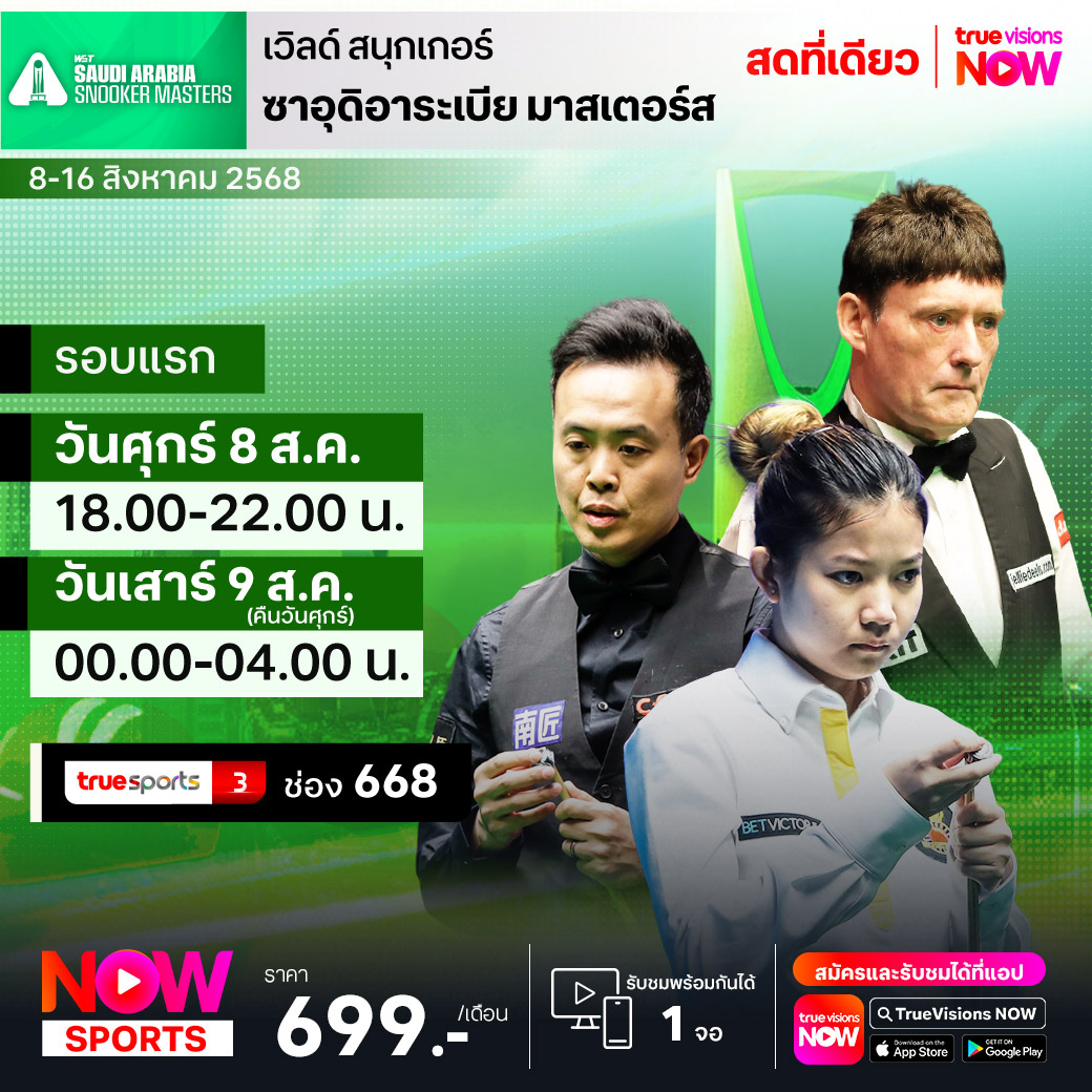 กลับมาอีกครั้งกับความยิ่งใหญ่ระดับ บิ๊ก อีเวนท์ ของ เวิลด์ สนุกเกอร์ ทัวร์ เก็บคะแนนสะสมโลก สัปดาห์นี้ พาแฟนๆ ไปสัมผัสความอลังการของ ซาอุดิอาระเบีย สนุกเกอร์ มาสเตอร์ส ที่ระดมเอามือดีระดับซูเปอร์สตาร์มาชิงแชมป์และเงินรางวัลรวมระดับมหาศาล จาก ไอคอนนิก กรีน ฮอลล์ เมืองเจดดาห์ ซาอุดิอาระเบีย ชมสด ครบทุกรอบ แบบเอ็กซ์คลูซีฟ ที่เดียวที่ ทรูวิชั่นส์