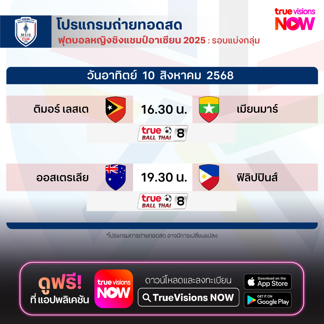 วันนี้มีอะไรดูที่ ทรูวิชั่นส์ ประจำวันอาทิตย์ที่ 10 สิงหาคม 68 ยังคงมีกีฬาที่น่าสนใจให้ได้ตามลุ้นตามเชียร์กันเหมือนเดิม โดยในส่วนของฟุตบอลนั้น ยังมีศึก สกอตติช พรีเมียร์ชิพ, เมเจอร์ ลีก ซอคเก้อร์, ฟุตบอลหญิงชิงแชมป์อาเซียน 2025 และศึกฟุตซอลไทยลีก ให้ได้ตามเชียร์กันต่อ ส่วนกีฬาอื่นๆ ยังมีเทนนิส เอทีพี ทัวร์ และ ดับเบิ้ลยูทีเอ ทัวร์ รายการ ซินซินแนติ โอเพ่น, กอล์ฟ พีจีเอ ทัวร์ รายการ เฟดเอ็กซ์ เซนต์ จู๊ด แชมเปี้ยนชิพ, กอล์ฟ ดีพี เวิลด์ ทัวร์ รายการ เน็กโซ่ แชมเปี้ยนชิพ, เวิลด์ สนุกเกอร์ ทัวร์ รายการ ซาอุดิอาระเบีย สนุกเกอร์ มาสเตอร์ส และ เมเจอร์ ลีก เบสบอล งานนี้ ทรูวิชั่นส์ จัดเต็มให้ชมกันถึงบ้าน