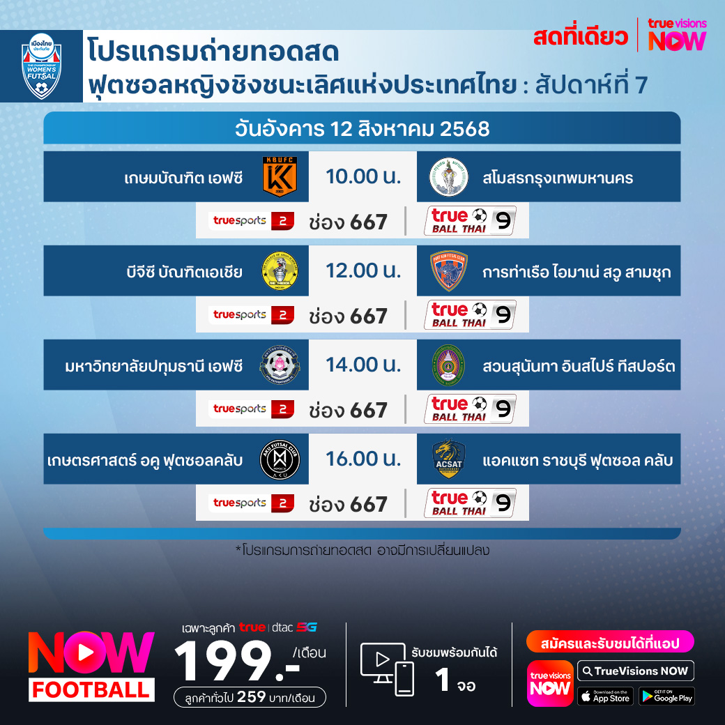 เกษตรศาสตร์ อคู ฟุตซอลคลับ พบ แอคแซท ราชบุรี ฟุตซอล คลับ เวลา 16.00 ทางช่อง TS 2 (667) / True Ball Thai 9