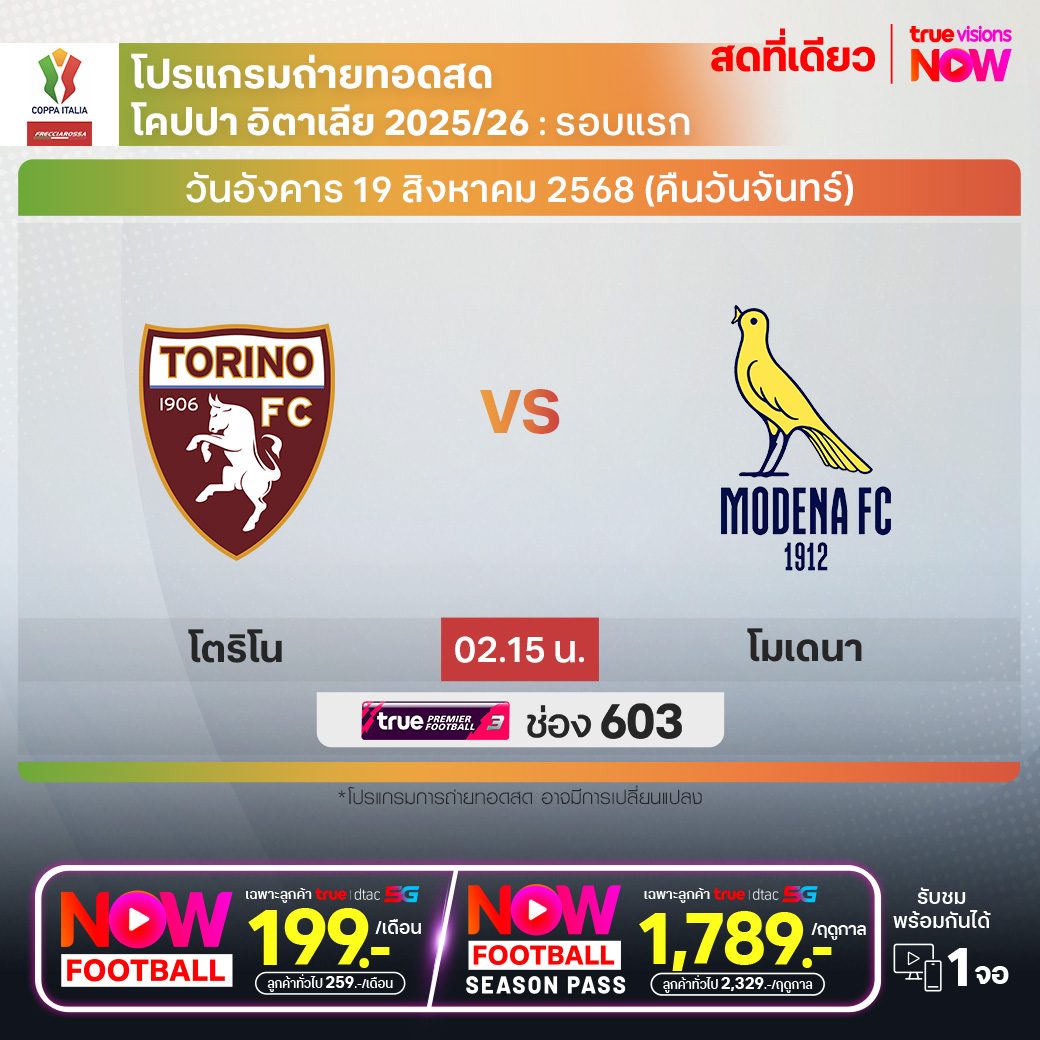 Torino vs Modena เวลา 02.15-04.15 ทางช่องTPF 3(603)