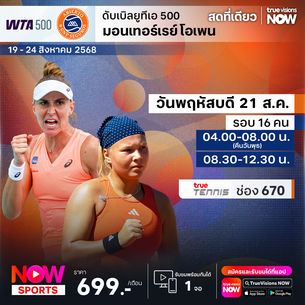 เทนนิสหญิง ดับเบิ้ลยูทีเอ ทัวร์ สัปดาห์นี้พบกับรายการ มอนเทอร์เรย์ โอเพ่น จากประเทศเม็กซิโก เป็นรายการสุดท้ายก่อนจะเข้าสู่แกรนด์สแลมสุดท้ายของปี ยูเอส โอเพ่น รายการนี้เปิดโอกาสให้นักกีฬาได้เตรียมความพร้อมอย่างเต็มที่ และได้เก็บคะแนนสะสมก่อนจะเข้าสู่รายการแกรนด์สแลม ร่วมลุ้นกันว่าใครจะคว้าแชมป์ไปครอง ชมสด จนถึงรอบชิงชนะเลิศ ที่ ทรูวิชั่นส์