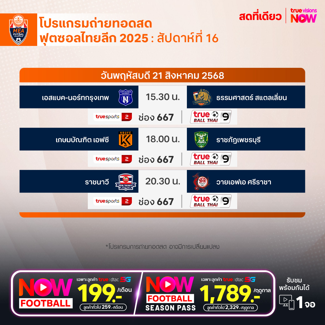 เอสแบค-นอร์ทกรุงเทพ พบ ธรรมศาสตร์ สแตลเลี่ยน เวลา 15.30 ทางช่อง TS 2 (667) / True Ball Thai 9