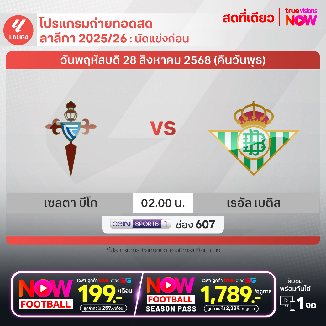 Celta Vigo vs Real Betis เวลา 02.00-04.00 ทางช่อง beIN 1 (607)