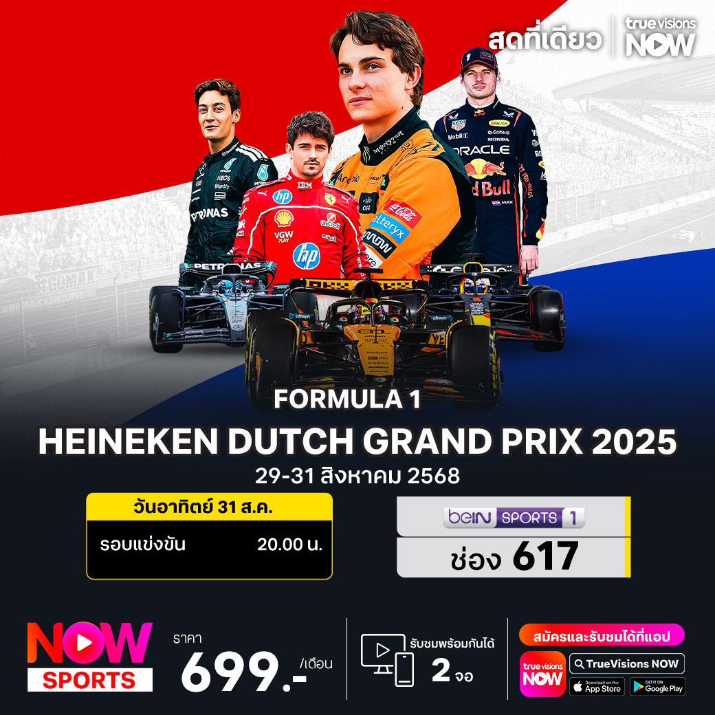 ศึกฟอร์มูล่า วัน ฤดูกาล 2025 เข้มข้นขึ้นไปทุกขณะ สัปดาห์นี้เข้าสู่การแช่งขันสนามที่ 15 กับศึก ดัตช์ กรังด์ปรีซ์ ที่แซนด์โฟร์ท ประเทศเนเธอร์แลนด์ จับตาดูแชมป์โลก 4 สมัย แม็กซ์ เวอร์สแท็ปเพน มุ่งมั่นทำผลงานเต็มที่เพื่อสร้างความประทับใจในโฮมเรซ ส่วนเต็งหนึ่งอย่างทีมแม็คลาเรน ลุ้นแชมป์ทั้ง แลนโด นอร์ริส และ ออสการ์ ปิแอสทรี่ ชมสด เอ็กซ์คลูซีฟ ทุกช่วงการแข่งขัน ที่ ทรูวิชั่นส์ ที่เดียว