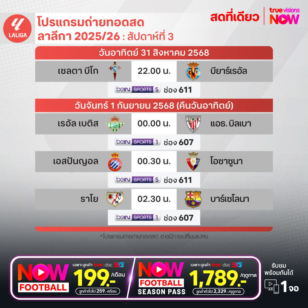 Espanyol vs Osasuna เวลา 00.30-02.30 ทางช่อง beIN 5 (611)