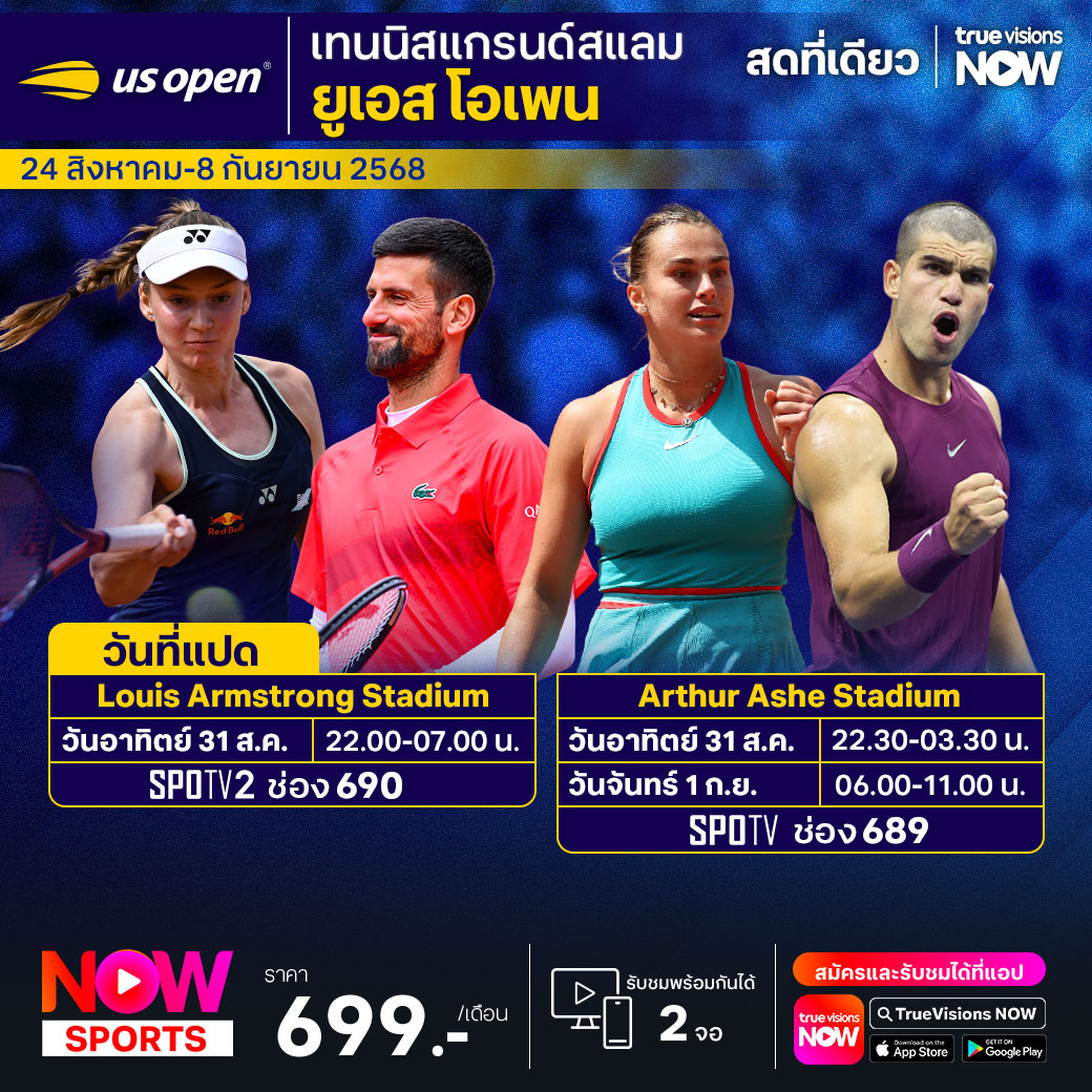 เทนนิสแกรนด์สแลมสุดท้ายของปี ยูเอส โอเพ่น แกรนด์สแลมที่ยิ่งใหญ่ที่สุดในแง่ของจำนวนคนดูและเงินรางวัล จากมหานครนิวยอร์ก ประเทศสหรัฐอเมริกา ร่วมลุ้นกันว่าแชมป์เก่าประเภทชายเดี่ยวและแชมป์เก่าในประเภทหญิงเดี่ยวจะสามารถป้องกันแชมป์ไว้ได้หรือไม่ ชมสด ครบทุกรอบ เอ็กซ์คลูซีฟ ที่ ทรูวิชั่นส์ ที่เดียว
