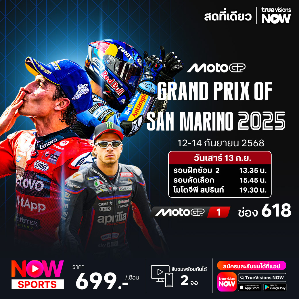แฟนๆ โมโต จีพี ลุ้นกันต่อเนื่อง กับการทำลายสถิติของ มาร์ก มาร์เกซ ยอดนัดบิดชาวสเปน ที่มีผลงานยอดเยี่ยมและร้อนแรงที่สุดในฤดูกาล 2025 กับการไล่ล่าคว้าแชมป์และโกยคะแนนให้กับต้นสังกัดใหม่อย่าง ดูคาติ ยักษ์ใหญ่ของวงการจากอิตาลี สัปดาห์นี้ มันส์กันต่อกับการแข่งขันสนามที่ 16 ในรายการ กรังด์ปรีซ์ ออฟ ซาน มาริโน่ ที่สนาม มิซาโน่ เวิลด์ เซอร์กิต มาร์โก้ ซิมอนเชลลี่ ในเมืองริมินี่ ประเทศอิตาลี ชมสด เอ็กซ์คลูซีฟ ครบทุกช่วงการแข่งขัน ที่ ทรูวิชั่นส์