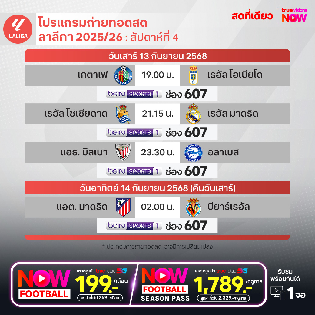วันนี้มีอะไรดูที่ ทรูวิชั่นส์ ประจำวันเสาร์ที่ 13 กันยายน 68 ยังคงมีกีฬาที่น่าสนใจให้ได้ตามลุ้นตามเชียร์กันเหมือนเดิม โดยในส่วนของฟุตบอลยังมีศึก ลา ลีกา สเปน, บุนเดสลีกา เยอรมนี, สกอตติช พรีเมียร์ชิพ และ ซาอุดิ โปร ลีก ให้ได้ตามเชียร์กันต่อ ส่วนคอมอเตอร์สปอร์ต พลาดไม่ได้กับศึก โมโต จีพี รายการ กรังด์ปรีซ์ ออฟ ซาน มาริโน่ ขณะที่กีฬาอื่นๆ ยังมีเทนนิสหญิง ดับเบิ้ลยูทีเอ ทัวร์ รายการ กัวดาลาฮารา โอเพ่น, กอล์ฟ พีจีเอ ทัวร์ รายการ โปรคอร์ แชมเปี้ยนชิพ, ดีพี เวิลด์ ทัวร์ รายการ บีเอ็มดับเบิ้ลยู พีจีเอ แชมเปี้ยนชิพ, แอลพีจีเอ ทัวร์ รายการ โครเกอร์ ควีน ซิตี้ แชมเปี้ยนชิพ, แบดมินตัน บีดับเบิ้ลยูเอฟ รายการ ฮ่องกง โอเพ่น, เมเจอร์ ลีก เบสบอล, รักบี้ แชมเปี้ยนชิพ, วอลเลย์บอล เยียวซุ นงฮยับ คัพ และ วอลเลย์บอล เอสวี ลีก เวิลด์ ทัวร์ งานนี้ ทรูวิชั่นส์ จัดเต็มให้ชมกันถึงบ้าน