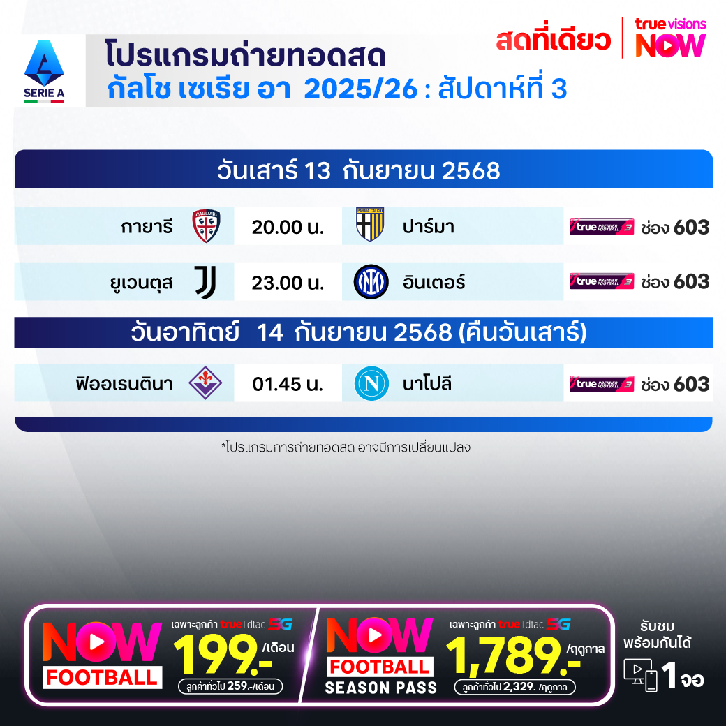 Fiorentina vs Napoli เวลา 01.45-03.45 ทางช่องTPF 3(603)