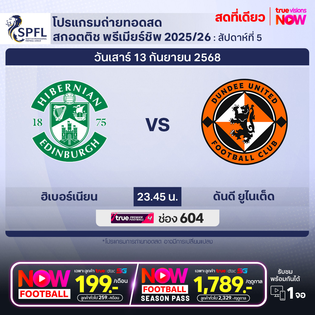 Hibernian vs Dundee United เวลา 23.45-01.45 ทางช่องTPF 4(604)