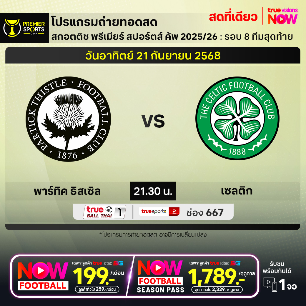 Partick Thistle vs Celtic เวลา21.30-23.30 ทางช่อง True Ball Thai 1 / TS 2 (667)