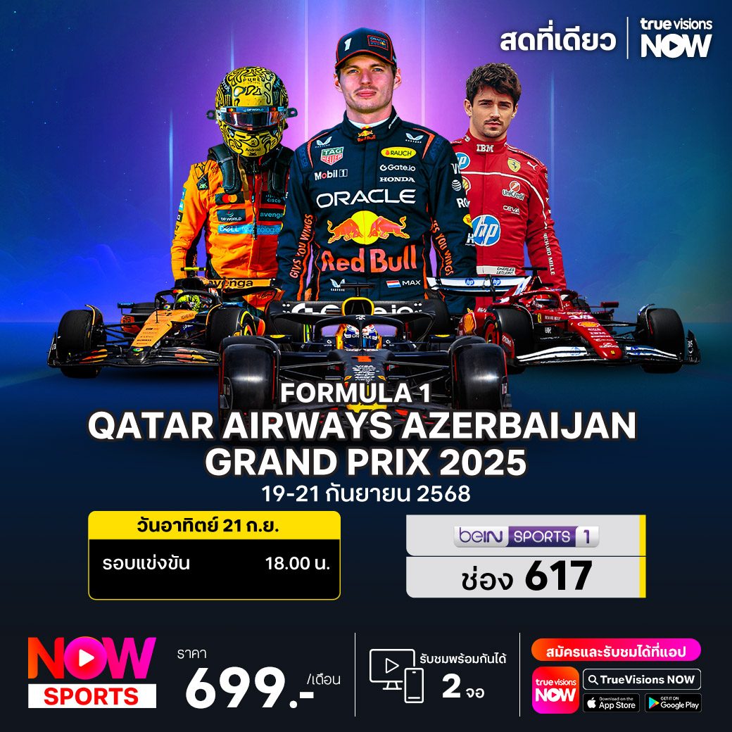 ศึก ฟอร์มูล่า วัน สัปดาห์นี้ ไปกันที่สนามที่ 17 ของฤดูกาล ในรายการ อาเซอร์ไบจัน กรังด์ปรีซ์ ที่สนาม บากู ซิตี้ เซอร์กิต ประเทศอาเซอร์ไบจัน ชมการดวลเดือดชนิดที่ไม่มีใครยอมใคร จับตาดูทีมเต็งแชมป์ แม็คลาเรน จะรับมือกับการกดดันจากคู่แข่งระดับพระกาฬอย่าง เร้ดบูลล์, เฟอร์รารี่ และ เมอร์เซเดส ได้ดีแค่ไหน ชมสด เอ็กซ์คลูซีฟ ครบทุกช่วง ที่ ทรูวิชั่นส์