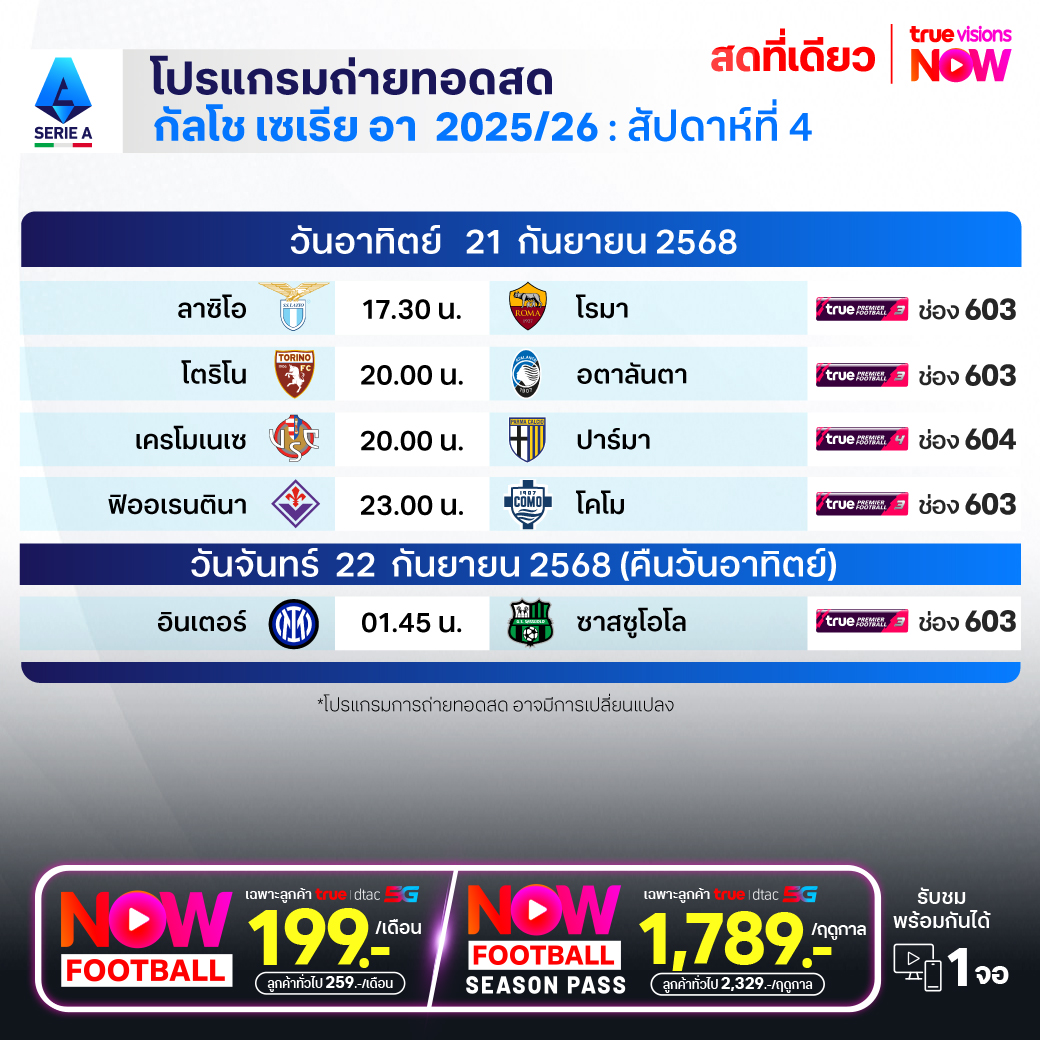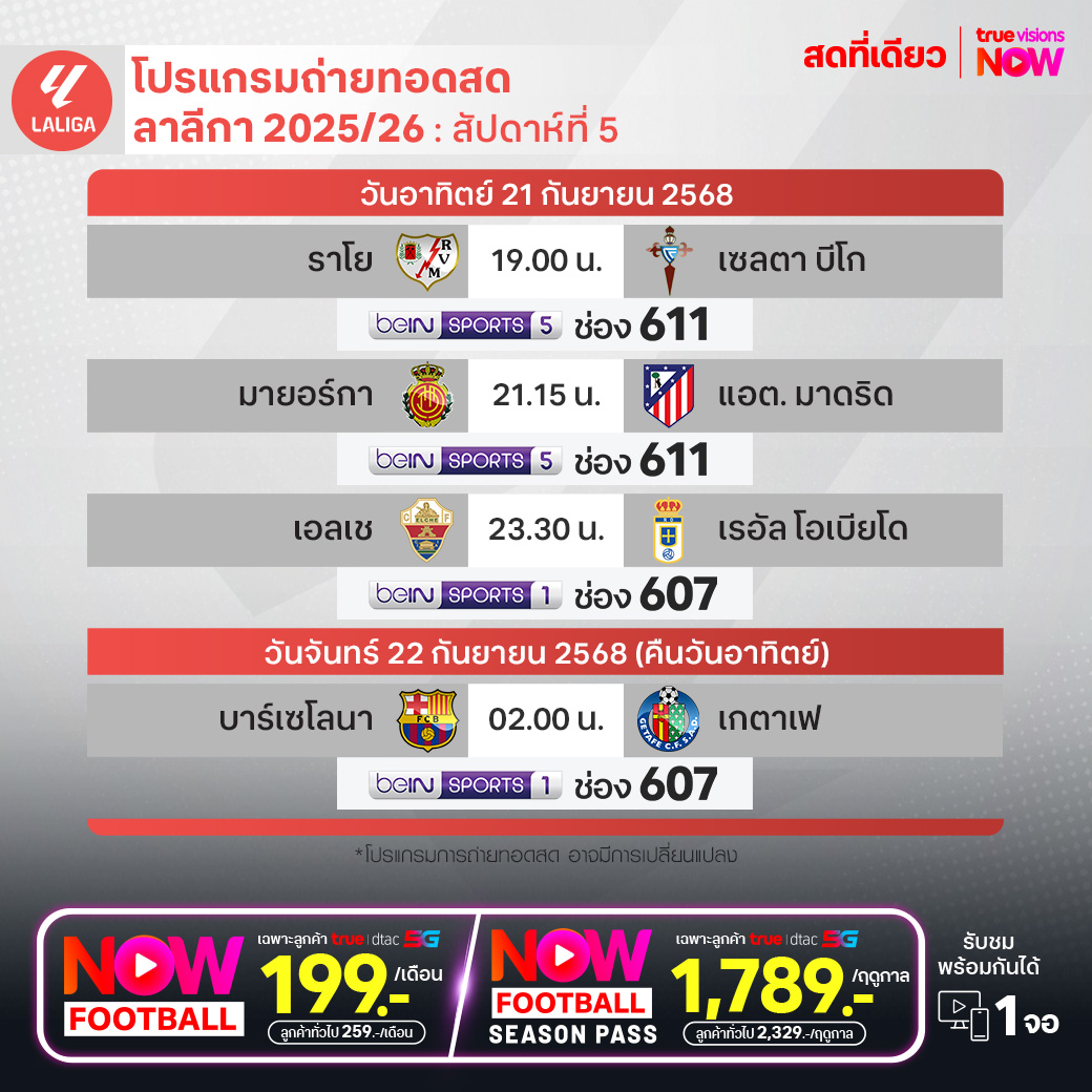 วันนี้มีอะไรดูที่ ทรูวิชั่นส์ ประจำวันอาทิตย์ที่ 21 กันยายน 68 ยังคงมีกีฬาที่น่าสนใจให้ได้ตามลุ้นตามเชียร์กันเหมือนเดิม โดยในส่วนของฟุตบอลยังมีศึก ลา ลีกา สเปน, กัลโช่ เซเรีย อา อิตาลี, บุนเดสลีกา เยอรมนี, สกอตติช พรีเมียร์ สปอร์ตส์ คัพ และ เมเจอร์ ลีก ซอคเก้อร์ ให้ได้ตามเชียร์กันต่อ ส่วนกีฬาอื่นๆ คอมอเตอร์สปอร์ตพลาดไม่ได้กับศึก ฟอร์มูล่า วัน รายการ อาเซอร์ไบจัน กรังด์ปรีซ์ และ ฟอร์มูล่า 2 แชมเปี้ยนชิพ บากู อาเซอร์ไบจัน นอกจากนี้ยังมีเทนนิสทีมชาย เลเวอร์ คัพ, เทนนิสหญิง ดับเบิ้ลยูทีเอ ทัวร์ รายการ โคเรีย โอเพ่น, เทนนิสหญิง บิลลี่ จีน คิง คัพ, กอล์ฟ ดีพี เวิลด์ ทัวร์ รายการ เฟดเอ็กซ์ โอเพ่น เดอ ฟร้องซ์, พีจีเอ ทัวร์ แชมเปี้ยนส์ รายการ เพียว อินชัวรันซ์ แชมเปี้ยนชิพ, แอลพีจีเอ ทัวร์ รายการ อาคันซอว์ แชมเปี้ยนชิพ, เคแอลพีจีเอ ทัวร์ รายการ ฮาน่า ไฟแนนเชี่ยล กรุ๊ป แชมเปี้ยนชิพ, เวิลด์ สนุกเกอร์ ทัวร์ รายการ อิงลิช โอเพ่น, แบดมินตัน บีดับเบิ้ลยูเอฟ รายการ ไชน่า มาสเตอร์ส, เมเจอร์ ลีก เบสบอล และ วอลเลย์บอล เยียวซุ นงฮยับ คัพ งานนี้ ทรูวิชั่นส์ จัดเต็มให้ชมกันถึงบ้าน